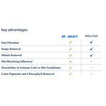 SD - Select does not require drying of the oil to achieve optimal performance which results in a more efficient removal of chlorophyll and color bodies in bleaching regardless of the type of bleaching clay.